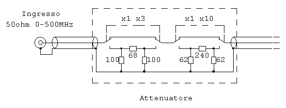 Sul pannello frontale dello strumento è previsto il connettore BNC per l’ingresso del segnale 2-500MHz 50ohm che attraverso un adatto cavo schermato si collega internamente all’attenuatore e da questo all’ingresso del circuito.
