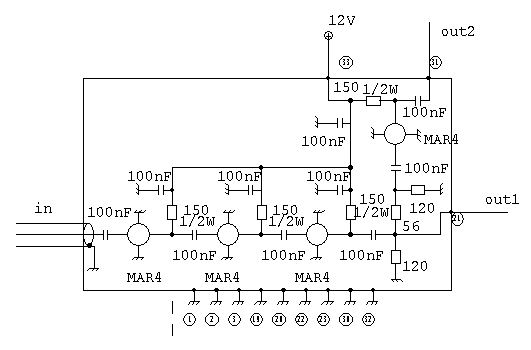 Grazie all’uso dei circuiti ibridi MAR-4 si riesce ad ottenere ottimi risultati di piattezza di banda con una certa facilità. Anche qui la disposizione dei componenti e il piano di massa svolgono un ruolo importante.