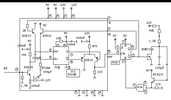 Il circuito è costruito attorno all’integrato U264B che restituisce in uscita un segnale ad onda quadra la cui frequenza è 1/64 di quella del segnale in ingresso.