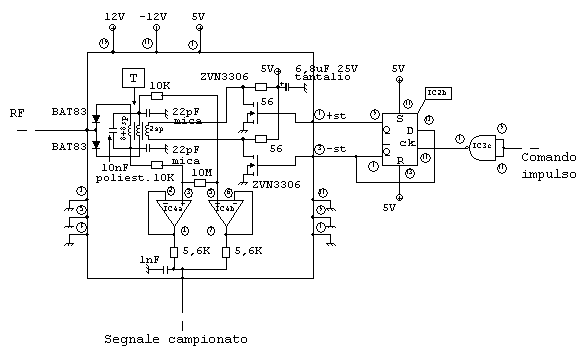 L’unico punto di connessione verso altri componenti è il collegamento tra i due diodi che comunica anche con l’uscita dell’amplificatore RF dove è presente il segnale di ingresso amplificato ma, essendo i diodi per la maggior parte del tempo interdetti, solo durante il brevissimo impulso di conduzione quel punto si connette e possono circolare cariche tra l’uscita dell’amplificatore e i due condensatori da 22pF (che devono essere a bassissime perdite).