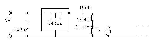 Questo è lo schema di un generatore di segnale ad onda quadra 64MHz ottenuto con un circuito ibrido quarzato del tipo in uso nei computer.