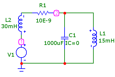 Come si vede al ciruito originale si è dovuto aggiungere una resistenza (R1) per renderlo "calcolabile" (un circuito che comporta una corrente infinita sia pure al tempo infinito, può essere matematicamente accettabile , ma non è valido per una simulazione).