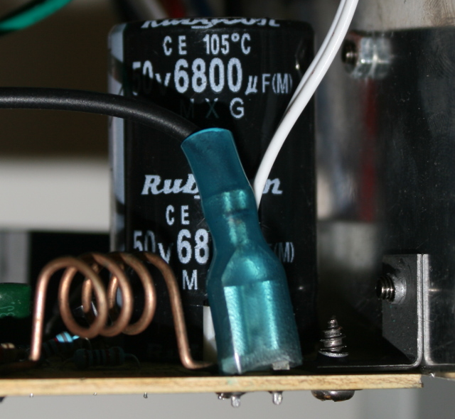 Il condensatore elettrolitico, costretto dal sadico progettista a lavorare a testa in giù, è un 6800µF 50V; il valore mi sembra un po' scarso.