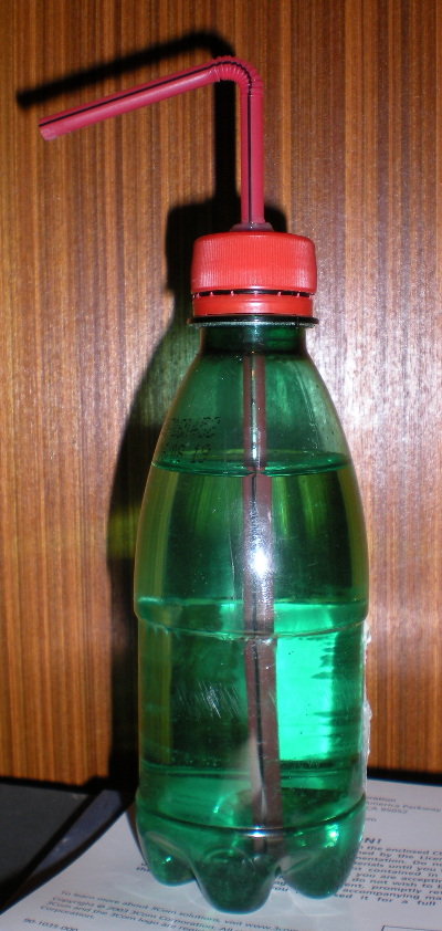 Come potete notare nella prima foto, alle spalle della stazione saldante si nota una bottiglietta verde che non è una bottiglietta. Più precisamente essa era una bottiglietta d'acqua minerale da 25cl, di quelle erogate dai distributori automatici. Un foro sul tappo, una cannuccia pieghevole ed un po' di silicone l'hanno trasformata in un' utile spruzzetta, da tenere sempre piena d'acqua nei pressi della stazione saldante per mantenere umida la spugnetta con cui vi prenderete amorevole cura della punta dello stilo.