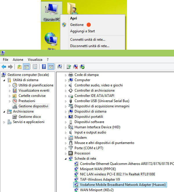 Una volta effettuata la disintallazione e la pulizia, spegniamo il computer, colleghiamo la chiavetta e accendiamo il PC. Quando il PC ha completato l'accesso, andiamo a controllare, in gestione dispositivi/periferiche (accessibile tramite tasto destro sull'icona Computer del desktop), se la chiavetta sia stata riconosciuta e correttamente installata.