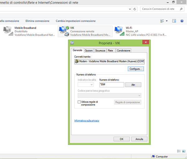 L'unica cosa che dovremo fare è rinominare la connessione come VIK (Vodafone Inernet Key), impostare la connessione come predefinita (tasto desto sulla connessione -> imposta come predefinita) e scrivere il numero da "chiamare" *99# per attivare la connessione internet (è uguale sia per Vodafone che per Tim).