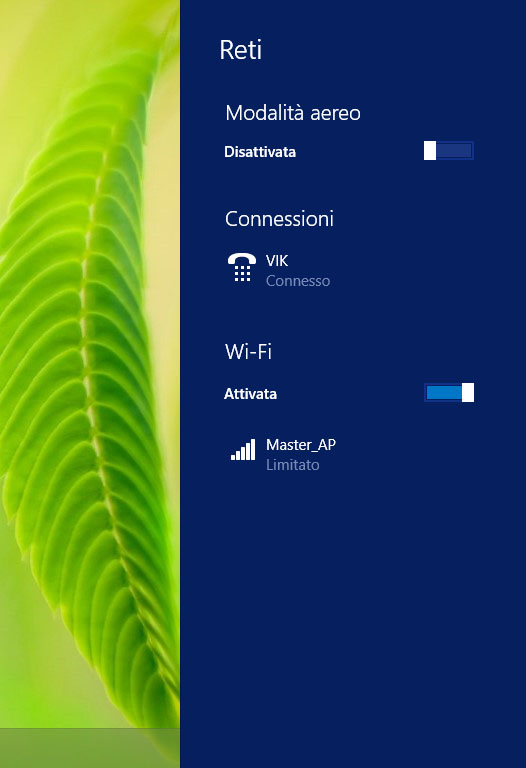 Tornando sul desktop e controllando sulla barra delle connessioni a scomparsa, sulla destra, dovremmo trovare la nostra connessione remota VIK, come nella foto sotto (il PC ha accesso limitato alla rete WI-FI volontariamente, poiché è solo connesso nella WLAN per usufruire della stampante e della condivisione di file, ma non ha i diritti per collegarsi a internet tramite l'Access Point).