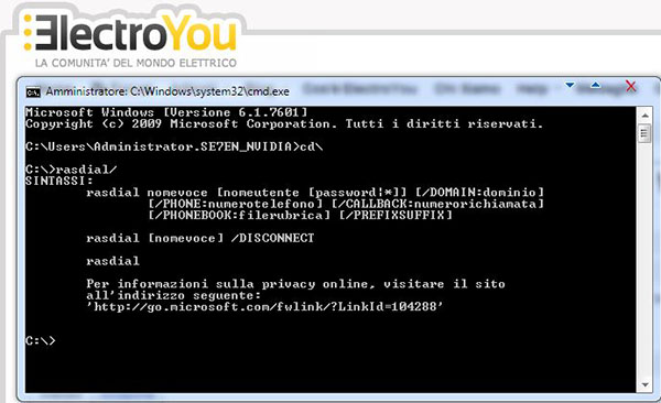 L'istruzione che andremo ad utilizzare, per creare il nostro file batch, è rasdial (link Mricrosoft). Per conoscere la sintassi da utilizzare e la lista dei comandi supportati, è sufficiente aprire il "DOS" (cmd.exe) e digitare rasdial/.